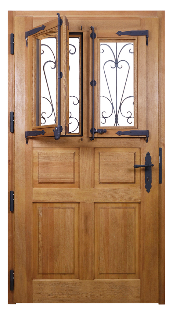Massivholzhaustüre, Kiefer massiv, ein Flügel mit 2 Glaseinsätzen, inkl. Türstock bis 10 cm, Isolierglasfenster, Innenisolierung, Doppelfalz, umlaufende Dichtung, verziertes Schmiedeeisengitter, Anschlagschiene, geschmiedete Bänder und Drückergarnitur aus unserem Sortiment, Oberfläche imprägniert und lasiert mit Osmo-Produkten.